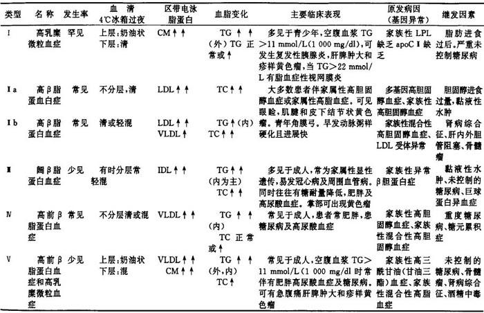 2.高脂蛋白血症 可分五型,其中Ⅱ型又可分为Ⅱa和Ⅱb两个亚型,见表4-3。 表4-3 五型高脂蛋白血症的主要特点