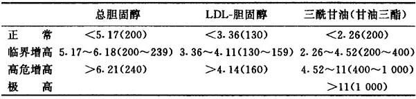 3.鉴别诊断 当胆固醇和三酰甘油(甘油三酯)均增高时,有如下情况: (1)胆固醇增高,三酰甘油(甘油三酯)在1.7~4.4mmol/L(150~400mg/dl),多为Ⅱb型高脂蛋白血症,系VLDL及LDL增高所致。 (2)胆固醇增高,三酰甘油(甘油三酯)在4.4~11mmol/L(400~1000mg/dl),如胆固醇/三酰甘油(甘油三酯)比值为0.6,多为Ⅳ型高脂蛋白血症,系VLDL增高所致。如该比值为1.0,可为Ⅲ型高脂蛋白血症,系IDL增高所致。 (3)胆固醇增高,三酰甘油(甘油三酯)>11mmol/L(1000mg/dl),则 1)大多属Ⅴ型高脂蛋白血症,多与乳糜微粒及VLDL增高有关。 2)偶尔可能是1型高脂蛋白血症,系乳糜微粒增高所致,青少年患者可有家族性脂蛋白脂肪酶或载脂蛋白C-Ⅱ缺乏;或偶尔是Ⅲ型高脂蛋白血症。 4.高脂血症程度 参考美国胆固醇教育方案,高脂血症程度可分临界增高,高危增高和极高三类,见表4-4。 表4-4高脂血症程度分类 单位:mmol/L(mg/dl)