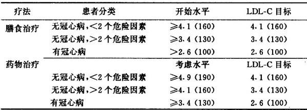 【防治】 1.防治策略 参考美国胆固醇教育方案,见表4-5。 表4-5 根据LDL-胆固醇(LDL-C)的治疗决策 单位:mmol/L(mg/dl)