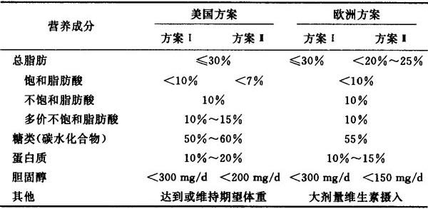 2.儿童和青少年治疗策略 因儿童、青少年胆固醇升高的标准与成人不同,故采取不同的治疗策略。 (1)胆固醇临界升高(TC=4.4~4.9mmol/L,LDL-C=2.9~3.3mmol/L)时,采用饮食方案Ⅰ。 (2)胆固醇升高(TC≥5.2mmol/L,LDL-C≥3.4mmol/L)时,采用饮食方案Ⅰ,而后饮食方案Ⅱ。 (3)只有在饮食疗法不奏效,并有以下两种情况时才使用药物治疗。 1)LDL-C≥4.9mmol/L。 2)尽管LDL-C≥4.1mmol/L,但有早发冠心病家族史或伴有二个以上的冠心病危险因素。 3.继发性高脂血症的治疗 应诊治基础疾病或加用降血脂药物。 4.膳食治疗 食疗方案,见表4-6。 表4-6 治疗和预防高脂血症的饮食方案