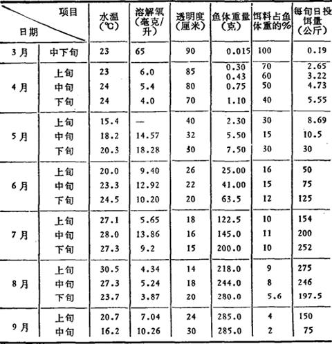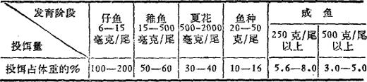 注:①鲤鱼当年养成商品鱼的试验,1982.3-1983.9月中旬。 ②试验面积25亩,单产252公斤,养成平均规格285克/尾。 ③3-4月份进行温室温流水育苗,500升容积水族箱,养12,600尾。 表3-16说明鲤鱼的不同发育阶段的相对摄食率有很大变幅,仔鱼阶段可投到体重的1倍至2倍,而到成鱼阶段投饵量只占体重的5%左右,这是与其基础代谢的水平及不同发育阶段的生长速率有密切关系(相对生长速率幼鱼明显高于成鱼,而绝对增重量成鱼却远远超过幼鱼)。 表3-16 鲤鱼不同发育阶段的日投饵量之变化(水温20-24℃)