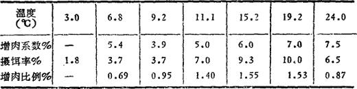 一般来说,在适宜的水温范围内,水温越高,饱食量就越大。以日本竹夹鱼为例,25℃时饱食量为15℃时的2倍左右。随着温度的上升,虹鳟摄食率和增肉系数也逐渐增加(表3-17)。 表3-17 水温与摄食率及增肉系数的关系(虹鳟)