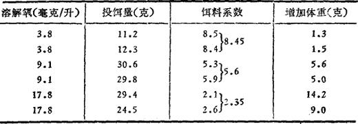 注:增肉比例%=摄饵率÷增肉系数(表示摄取饲料后实际增肉量对鱼体重的%)。 水中溶氧量减少时,摄食量也会减少。鲤鱼在溶氧饱和度为35%时的摄食量,只有饱和度为90%时的 表3-18 虹鳟鱼的生长,饵料系数同水中溶氧量之关系