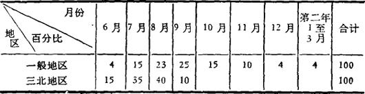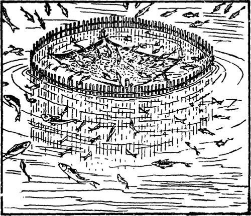 图2-31 鲢鳙鱼池食台 (2)定时 每天投喂的时间应相对稳定,一般每天两次即每天上午八、九点钟和下午二、三点钟各一次,气温太高下午可推迟到三、四点钟,如遇天气闷热和雷暴雨时应推迟或停喂,早上浮头需待正常后1-2小时再投喂。 (3)定质 所投的饲料必须新鲜、洁净、适口,不投腐败变质的饲料,以免引起鱼病。 (4)定量 投饲量应掌握均匀适量,避免过多过少或忽多忽少。投喂量应根据不同鱼类、不同规格、不同季节天气、水温水质情况以及鱼类吃食等情况参考表2-35灵活掌握。发病季节、天气闷热、气压低或雷雨前后投饵量要减少或停喂。每天下午4-5点钟检查吃食情况,如投喂的饲料全部吃光,第二天可适当增加或保持原投饵量,如吃不完第二天要减少。在不同季节的掌握上要做到“中间拥,两头不放松”。 表2-35 各月份饵料投放比例表(%)