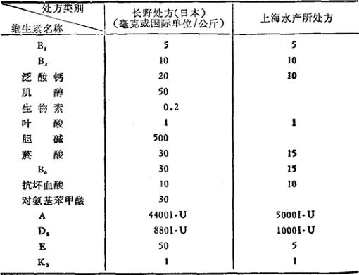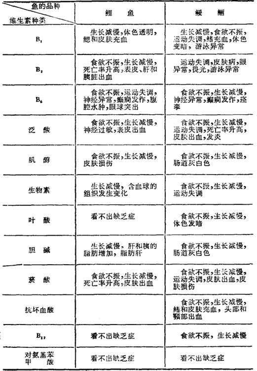 鱼类的维生素缺乏症是用精制饲料试验法进行的,对鲑科鱼类、虹鳟、鲤、鳗鲡、念鱼、香鱼等的维生素缺乏症进行过详细的研究,其中以水溶性维生素的研究为多,脂溶性维生素的研究较少。