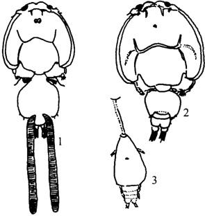图1-30 东方鱼鲺 1.雌体 2.雄体 3.附着幼体 病鱼体色发黑或灰白,动作呆滞,或时而狂游,食量降低,重者消瘦死亡。1979年8月,山东省水产学校养鱼试验池中梭鱼的感染率达100%,感染强度甚高,1尾体长6厘米的梭鱼,寄生虫体达100尾以上。 防治鱼鲺的方法为:彻底清池;将要放养的鱼种用2.5%的敌百虫浸洗30分钟;用0.3~0.4毫克/千克的敌百虫晶体(90%)全池泼洒;用淡水浸洗鱼体15~30分钟;用0.01%的福尔马林液浸鱼15分钟。 |
