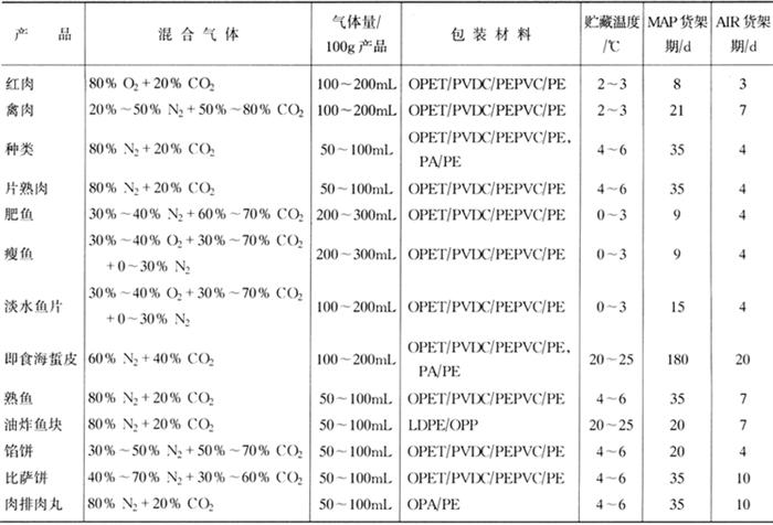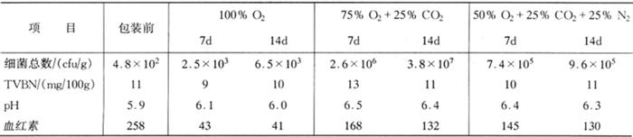 如表1-8-14所示,100%CO2气调包装,防腐效果最好,肉色最差,但一旦重新接触氧气,肉色会有所改善。用75%O2、25%CO2包装的肉的肉色最好,但防腐效果最差,亦即保质期最短。 表1-8-14 气调包装与普通包装货架期对照