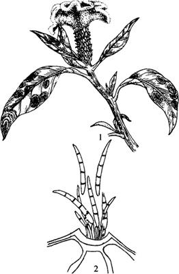 【病原】 鸡冠花轮纹病原菌为Cercosporella sp.。分生孢子梗无色,圆柱形,短小,不分枝,丛生,从寄主表皮气孔中伸出。分生孢子微弯或直,单生,无色,1~5个隔膜,基部钝圆,上部稍尖,大小36~72微米×4~7.2微米,9~11月发生,植株下部叶片感病比上部重。