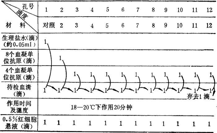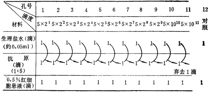 (1)每孔滴加生理盐水或PBS0.05毫升,共滴四排孔。 (2)以针管定量稀释器吸取1∶5稀释抗原0.05毫升于第1列孔,挤压4-6次混匀后,吸出0.05毫升至第2列孔,依次倍比稀释至倒数第2列孔,混匀后弃去0.05毫升,最后一列孔不加抗原作为对照。 (3)换去滴头吸0.5%红细胞悬液依次加入各孔,每孔0.05毫升。 (4)振荡1分钟,混匀。 (5)置室温下(18-20℃)30-40分钟。根据红细胞凝集图来判定结果,以4排孔出现完全凝集的抗原最大稀释度的几何均值作为该抗原的血凝滴度,即一个血凝单位。 (6)然后分别将抗原稀释成含8个和4个血凝单位的抗原稀释液,以备HI试验用。 2.微量血凝抑制(HI)试验见表2-14。 表2-14 微量血凝抑制(HI)