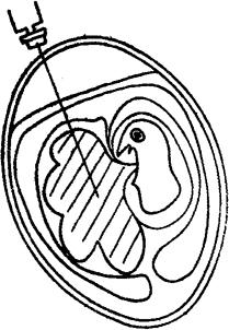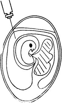 图3-2 鸡胚尿囊腔接种 ①选用发育良好的9-11日龄鸡胚。 ②在暗室中照蛋划出气室界限,并在绒毛尿囊膜发育良好区域内避开大血管处做一记号,定为注射接种部位。 ③将鸡胚气室朝上放在蛋盘或蛋架上,用碘酊、酒精分别消毒气室顶端和注射部位蛋壳,其后用钢锥在气室顶端和注射部位各打一小孔。 ④用1ml注射器抽取接种物,针头斜向(与卵壳成30°角)刺入注射部位,进针4-6mm达尿囊腔,注射接种物。接种量0.1-0.2ml。 ⑤另一种方法只开一小孔,即在距气室底边0.5厘米处的卵壳打一小孔,由此孔进针注射接种物至尿囊腔。 ⑥接种后,用熔化的石蜡封闭注射孔和气室小孔、气室朝上继续孵化,每天检卵1-2次,弃去接种后24小时内死亡胚胎,这些死胚多由机械损伤或细菌污染所致。 ⑦检视出的死胚,孵育48-72小时的活胚(依病毒性性质不同,要求孵化时间各异),取出置4℃冰箱过夜,以免收获时出血。 ⑧取出冷却后的鸡胚,气室朝上于蛋架上,气室端蛋壳用碘酊、酒精消毒后,用镊子击破气室部顶端蛋壳,并沿气室边缘将蛋壳去掉,防止蛋壳落入蛋内。用无菌眼科镊子以无菌操作,撕开或撕去壳膜,刺破绒毛尿囊膜,再用灭菌吸管吸取尿囊液和羊水,置于灭菌容器内,编号、记录后冻存备用。 ⑨取出胚胎置于平皿内,观察胚体变化并与没有接种病料,仅注射灭菌生理盐水或PBS的对照鸡胚比较,做好记录。 (2)鸡胚绒毛尿囊膜接种法(见图3-3)