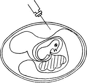 图3-4 鸡胚卵黄囊接种 ①选6-8日龄发育正常的鸡胚。 ②将鸡胚气室朝上放在蛋架上,用碘酊、酒精消毒气室部蛋壳,并在气室顶端打一小孔。 ③用带有长针头(3-4厘米)的注射器吸取接种物,针头自小孔垂直刺入,进针2-3厘米,即刺至鸡卵长径的1/2处,注入接种物0.2-0.5ml。 ④注射后用熔化的石蜡封闭注射孔,继续孵育,24小时内死胚弃去,每天检视1-2次。 ⑤取出孵化到时间的鸡胚,气室朝上于蛋架上,以碘酊、酒精消毒气室部蛋壳。去掉气室部蛋壳,无菌操作撕去壳膜,打开绒毛尿囊膜。 ⑥取出鸡胚置于无菌平皿中,观察记录病变。而后用镊子夹住卵黄囊脐带处,小心取出卵黄囊置于平皿中,或其他灭菌容器内冻存备用。 ⑦必要时用灭菌生理盐水冲去卵黄,将卵黄囊冻存,用于继代或用于其他检测。 ⑧病毒可通过卵黄进入鸡胚,鸡胚的含毒量有时也较高,必要时连同鸡胚一起收获,冻存备用。 以上三种鸡胚培养接种方法是较为常用的鸡胚接种途径。至于鸡胚羊膜腔接种法、鸡胚脑内接种法、鸡胚静脉接种法等接种途径,方法较为复杂,操作技术要求较高且熟练,但使用较少,在此不详细介绍,必要时可参阅书籍。 |