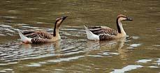 学名Anser cygnoides。鸟纲,鸭科。为家鹅的原祖。雄鸟体长达82厘米,雌鸟较小。嘴黑色,较头部为长。雄鸟嘴基有一膨大的瘤,雌鸟瘤不发达。两性体羽均为棕灰色,由头顶达颈后有一红棕色长纹。腹部有黑色条状横纹。栖息河川或沼泽地带。 主食植物。 飞行时,常排成“一”字形或“人”字形。分布于俄罗斯西伯利亚到堪察加半岛。 于中国境内主要在东北北部和内蒙古东部一带繁殖,在长江下游及稍南地区越冬。可驯养。