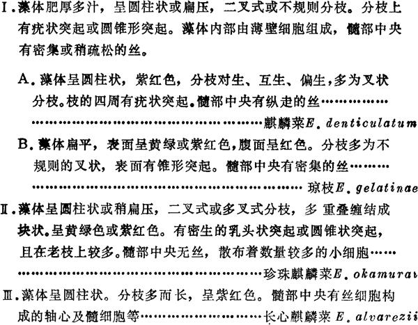 | 释义 | 麒麟菜人工养殖 (一)麒麟菜的生物学 1.麒麟菜的分类地位及我国养殖种类 麒麟菜在自然分类系统上属于:红藻门(Rhodophyta)、真红藻纲(Florideophyceae)、杉藻目(Gigartinales)、红翎菜科(Solieriaceae)、麒麟菜属(Eucheuma)。 我国麒麟菜主要养殖种类的检索表