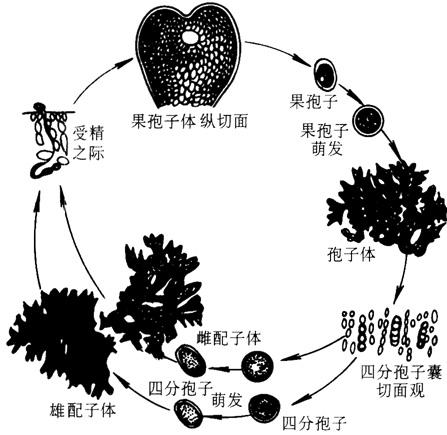 图6-25 麒麟菜的外形 藻体的大小因种类而异,一般为20~40厘米。藻体颜色鲜艳,有黄绿、暗红、浅黄、深绿各种不同的颜色,腹面多呈红色。新鲜的麒麟菜肥满多汁,藻体柔软。晒干后,大多数种类变为坚硬的软骨质。 2.内部构造 藻体内部由薄壁细胞组成,中央为髓部,髓部细胞细长,窄的呈丝状密集在中央,有的较为疏松,也有的无丝,而在薄壁细胞间分布着个体较小的细胞。皮层细胞圆形或多角形,内部大些向外逐渐变小,最外层细胞很小,含单核及带状色素体,细胞开始为单核,长成后为多核。下部由髓丝形成固着器。 (三)麒麟菜的繁殖和生活史 麒麟菜为多年生红藻,具有孢子体、配子体及果孢子体三个世代。孢子体和配子体在非生殖季节从外形无法加以区分,果孢子体寄生于雌配子体上。 孢子体成熟时,部分皮层细胞转化为四分孢子囊母细胞,每个四分孢子囊母细胞经过减数分裂形成4个四分孢子。孢子体的成熟期为4~6月。成熟后,四分孢子直接破囊而出,在水中漂浮下沉到珊瑚礁上,附着萌发成配于体世代的藻体。 麒麟菜的配子体,雌、雄异体。雄配子体和孢子体在外形上无甚区别。雄配子体成熟时,在小枝的两侧形成精子囊群。通常1个皮层细胞产生3~5个精子囊母细胞,每个精子囊母细胞再产生2~3个精子囊,每个精子囊内只有1个精子。因此,成熟的雄配子体的小枝切片观察时,可发现精子囊密密的排列在表面上。 雌配子体的外表和雄配子体相似,但成熟时,在小枝的侧面产生单生或几个集生的囊果,突出于小枝侧面,这时即可将雌雄配子体区分开来。果胞枝由3个细胞组成,由皮层细胞内侧生出,辅助细胞枝在侧面,包括一个单核的辅助细胞和许多细胞质浓厚而多核的初生营养细胞。它们在产孢丝发育后形成次生营养细胞,果胞受精后,产生长的连接管到达辅助细胞,合子核移入辅助细胞,其顶端分裂成原产孢丝,再发育为放射状的产孢丝。产孢丝顶端细胞或顶端的两个细胞形成果孢子囊,囊外为次生营养细胞包围。雄配子体成熟后,精子囊破裂,精子游离水中,漂流到雌配子体果胞的受精丝上,沿受精丝进入果胞,经过一段复杂的变化,形成许多果孢子囊,渐渐突出藻体表面,成为球形的囊果,即果孢子体。果孢子体上有一小的囊果孔,果孢子成熟后,即由此放出。果孢子附着在珊瑚礁上,即萌发成孢子体。下图为琼枝的生活史(图6-26)。