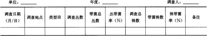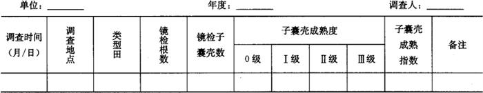 式中: D——子囊壳成熟指数; Yi——各级子囊壳根数; i——子囊壳成熟级1,2,3; Y——镜检总根数。 2.1.2.3 调查时间 结合稻桩带菌率调查进行。 2.1.2.4 调查方法 从带菌稻桩中取下一根子囊壳较多的稻桩,每类型田的总取样数应在10根以上,带回室内镜检。每根挑取子囊壳堆一角(包含里层和外层和子囊壳),放在有水滴的载玻片上,盖上盖玻片,压碎子囊壳镜检。检查结果记入稻桩子囊壳成熟度调查表(表4-114)。 表4-114 稻桩子囊壳成熟度调查表