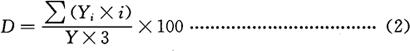 式中: L——加权平均稻桩子囊壳丛带菌率; li——某一类型田子囊壳平均丛带菌率; R——该类型田所占面积的百分率。 2.1.2 稻桩子囊壳成熟度调查 2.1.2.1 子囊壳成熟度分级指标 以显微镜视野内大多数孢子的成熟程度为定级依据,共分4级: 0级:子囊壳形成,但无子囊和子囊孢子; Ⅰ级:子囊期,压破只见棍棒状和菊花状簇生子囊,未见子囊孢子; Ⅱ级:子囊孢子期,子囊孢子分隔清楚,或子囊内有明显可辨的孢子; Ⅲ级:子囊孢子释放期,子囊壳体积大,易碎,内有大量子囊孢子,子囊壳表面常有灰色或粉红色粉末。 2.1.2.2 子囊壳成熟指数按式(2)计算: