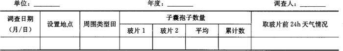 2.1.3 空中孢子捕捉 用空中孢子捕捉器来捕捉子囊孢子,以空中孢子的相对浮游量来表示菌源量的多少。 2.1.3.1 孢子捕捉器的设置 采用电动回转式自控孢子捕捉器。捕捉器臂长15~17cm,转臂至地面1.5m,微型电动机转速为1500r/min。 2.1.3.2 黏孢载玻片 采用厚度为1~1.5mm的载玻片,安装上转臂呈45°角,在回旋迎风面上均匀涂上白凡士林薄膜。 2.1.3.3 捕捉时间和管理 宜在小麦孕穗期连续捕捉20~30天。每天捕捉时间为凌晨零时至2时,早晨8时收片,傍晚装片。 2.1.3.4 镜检和记载 镜检时在玻片中央滴一小滴无菌水,仔细盖上18mm×18mm盖玻片,用10×10倍带十字推进器的生物显微镜计数18mm×18mm范围内的子囊孢子数量,比较识别非赤霉病菌孢子。镜检结果记入空中孢子捕捉记载表(表4-115)。 表4-115 空中孢子捕捉记载表