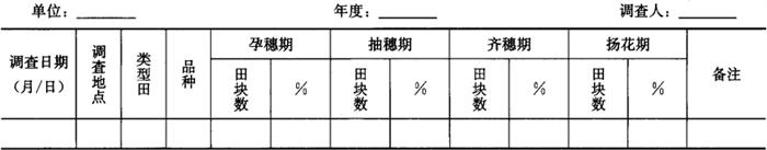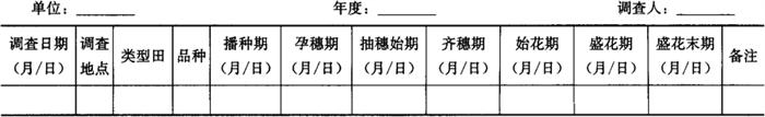2.2 麦田生育期观察 2.2.1 生育期观察记载标准 孕穗期:10%麦类剑叶环露出为孕穗始期;50%剑叶环露出为孕穗期;80%剑叶环露出为孕穗末期。 抽穗期:以顶部1~2个小穗抽出剑叶环为抽穗;10%麦株抽穗为抽穗始期;50%抽穗为抽穗期;80%抽穗为齐穗期。 开花:以麦类中部小穗花为开花;10%麦穗开花为始花期;50%开花为盛花期;80%开花为盛花末期。 2.2.2 生育期系统观察 结合病情系统观察时进行。观察圃设置见2.3.1病圃设置。当观察圃中部分麦株剑叶环出现时开始,每隔2天目测调查1次。记载孕穗期、抽穗始期、齐穗期、始花期、盛花期、盛花末期。记入大小麦生育期系统调查记载表(表4-116)。 表4-116 大小麦生育期系统调查记载表
