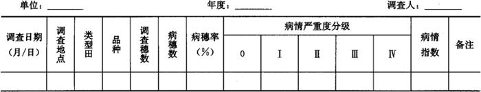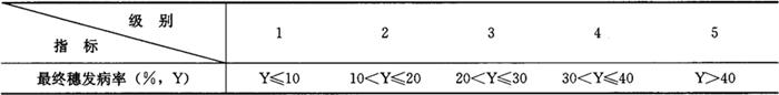 注:浙江省农科院植保所。 4 测报调查参考资料 4.1 术语解释 4.1.1 病情严重度 病情严重度用目测法共分5级: 0级:无病; Ⅰ级:病小穗数占全部小穗的1/4以下; Ⅱ级:病小穗数占全部小穗的1/4~1/2; Ⅲ级:病小穗数占全部小穗的1/2~3/4; Ⅳ级:病小穗数占全部小穗的3/4以上。 4.1.2 病情指数按式(3)计算