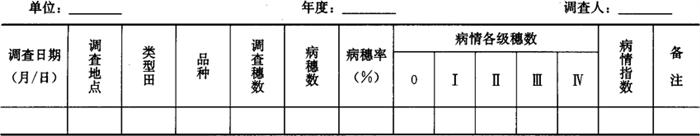2.3.3 病情普查 于当地小麦主要品种蜡熟期进行(收割前7~10天)。选择各类型田20块,其中应包含一定数量的未防治田块,每块随机取样500株。记载病穗率、病情指数和防治情况,记入病情普查记载表(4-119)。 表4-119 病情普查记载表