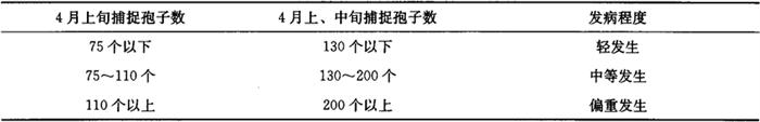 3 预测预报方法 3.1 长期预报 如上年7、8月份均温低于26℃,9、10月总降雨量大于200mm,玉米秆带菌率大于5%,晚播麦面积占15%,小麦长势旺,天气预报3~5月降雨量高于常年,则可预报赤霉病将严重流行。最晚在大小麦抽穗前1个月,对发生趋势做出的估计,以作为制定防治方案、防治药械准备的依据。 3.2 中期预报 4月中旬初麦类抽穗前做出。如4月上、中旬雨日6天以上,平均相对湿度大于70%,玉米秆带菌率大于15%,子囊壳成熟早,天气预报4月下旬至5月中旬降雨量在13天以上,并有3天以上连阴雨日,降雨量大于100mm,相对湿度大于80%,可预报赤霉病将严重流行。 3.3 短期预报和校正预报 防治活动前3~10天做出的预报,对中期预报作校正,确定防治田及防治时间。一般于4月下旬根据子囊壳成熟指数及空中孢子捕捉数量、小麦抽穗扬花进度进行分析预报。如果雨量大,或10日内雨日超过5天,立即发出严重发生的预报,迅速进行分类防治。 根据近期天气和病情,做出校正短期预报,以指导第二次防治。 3.4 菌量指标 抽穗前稻桩子囊壳丛带菌率接近常年平均值为中度流行,高于常年平均值可能大发生,低于常年值可能轻发。 空中孢子浮游量与发病程度的关系:空中孢子捕捉量多于常年则为流行菌量;反之轻。