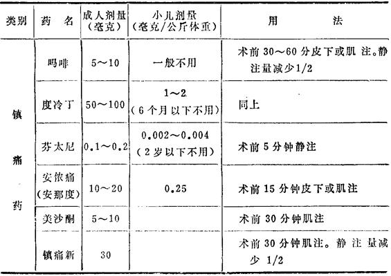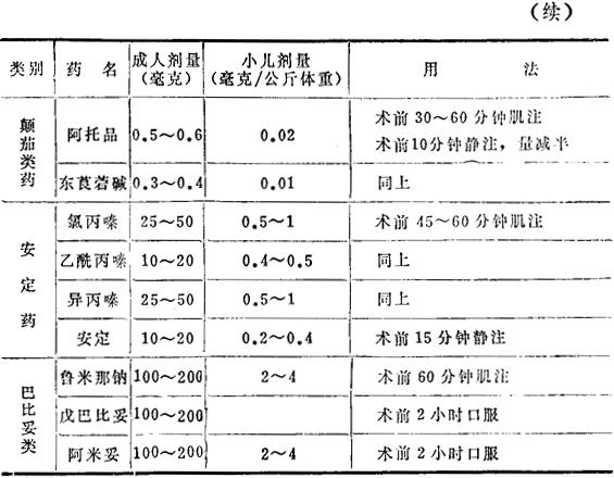 | 释义 | 麻醉前用药 在麻醉前1/2~2小时,预先给病人使用某些药物的方法称为麻醉前用药,其目的在于: 一、减轻病人对手术的恐惧和紧张,提高麻醉的安全性。 二、提高痛阈,弥补某些麻醉方法本身镇痛不全的不足。 三、降低病人的基础代谢,使麻药用量减少,麻醉过程平稳。 四、减轻植物神经(尤其是副交感神经)的过度兴奋,减少术中发生反射性低血压、心动过缓等不良反应,保护循环系统稳定。 五、减少呼吸道分泌物,保证呼吸道通畅,减少肺部并发症。 六、预防或减轻局部麻醉药的中毒反应。 常用的麻醉前用药有四类:镇痛类药、颠茄类药、巴比妥类药及安定药,其药理作用特点详见第三、四章。 【用法和用量】 麻醉前用药应根据所拟行的麻醉方法及病情特点,来选择其药物的种类、剂量、用药时间和途径,详见表1~3。手术前一天晚上,宜常规口服巴比妥类药,以求充分睡眠。一般病人的麻醉前用药可根据所拟行的麻醉方法,作如下选择: 表1~3 麻醉前用药的用法和用量