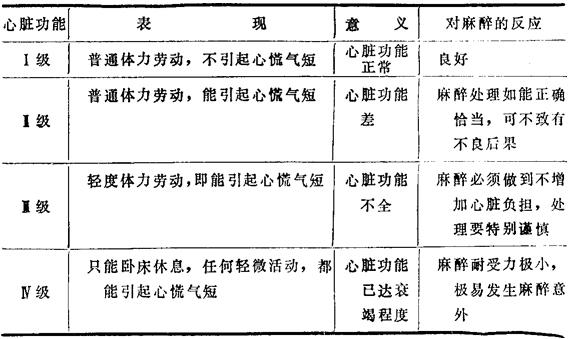 | 释义 | 麻醉前病人检查 一、体重 (一)体重过重者,麻药剂量可能较一般为大。 (二)体重较正常为轻者,麻药剂量应适当减少。 (三)近期内体重逐渐上升者,对麻醉的反应多半较好。 (四)近期内体重显着减轻者,对麻醉的反应多半很差,应加注意。 (五)对于过度消瘦或极度肥胖的病人,施行麻醉时必须警惕,最好不用全麻。 (六)小儿病人术前应常规测量体重。如果实际体重较年龄体重(即年龄×2+7)大,用药量宜根据实际体重计算。如果实际体重较年龄体重小,用药量宜根据年龄体重的偏小量计算。 二、体温 (一)体温上升,常表示体内存在炎症,或有代谢紊乱,则麻醉用药和剂量都需慎重,一般耐药量均差,氧的供应必须充分。 (二)体温较正常人为低者,表示代谢低下,情况很差,对麻醉的反应也常不佳。 三、肺部 重视肺部听诊和叩诊,参阅X线透视或照片结果。 (一)如有急性上呼吸道感染症状,如鼻堵塞、咽部充血疼痛、咳嗽或有急性气管、肺部炎症时,除非急症,宜暂停手术,直至治愈一周后再手术。 (二)如有慢性气管、肺部疾病时,禁用乙醚等刺激呼吸道的麻药,注意痰量的多少、痰的性质,以及是否浓稠不易咳出,并须采取防止术后肺部并发症或肺部病变播散的措施。 四、呼吸道的通畅程度 鼻道不通畅(如鼻中隔偏歪、鼻甲肥大、鼻息肉等)、扁桃体肿大、颈部肿物压迫气管、声带麻痹、大量咯血或呕血、频繁呕吐、昏迷,以及过度肥胖、颈项过短等情况,都较容易在麻醉中发生呼吸道阻塞,故以采用清醒气管内插管术为妥,或事先做好抢救呼吸道阻塞的准备(如气管插管用具、吸引器、气管切开器械包及气管镜等)。 五、呼吸情况 呼吸次数、深度、型式(即胸式呼吸、腹式呼吸)及呼吸交换量大小。对于全麻病人,尤其是用乙醚麻醉的病人,极为重要。麻醉深浅的正确判断,麻醉能否顺利进行,以及手术后是否会发生麻醉并发症,都和以上呼吸情况有关。 六、心脏 (一)心脏叩诊有心脏扩大者,在麻醉用药量、麻醉深度、氧供应、输液速度和输液量,以及消除手术不良刺激等处理,都应格外谨慎合理,因这类病人对麻醉的反应都很差。 (二)心脏听诊有杂音,但无心脏功能障碍的病人,对麻醉的反应未必太差。 七、血压、脉搏 (一)对高血压或动脉硬化的病人,麻醉处理应十分谨慎,事先要很好估计心脏功能状态、有无冠状动脉供血不足,以及脑、肾的病理改变程度。 (二)对血压过低及周围循环衰竭的休克病人,麻醉也不易处理,应谨慎从事,详见第十二章第一节。 (三)对脉搏明显不规则(次数、强弱、节律异常)的病人,应进一步检查心电图,确定心律失常的性质及其严重程度。对严重心律失常的病人,术前应采取适当的治疗用药,术中应做好心跳骤停的抢救。 八、心脏功能 (一)采用全麻、腰麻以及复杂大手术,病情危重,有心脏血管或心力衰竭病史的病人,都应在术前对其心脏功能做出估计,以决定术前是否须用洋地黄类药,同时要使病人充分镇静和休息。麻醉和手术应在心功能获得改善后再进行。术中要注意病人对麻药的耐受力,麻药用量一般均应减小。限制输液、输血的量和速度。并要保证充分供氧。 (二)心脏功能的临床估计方法有以下几种: 1.根据病人体力活动后的表现,心脏功能一般分四级,详见表1~2。 表1~2 心脏功能分级及其意义