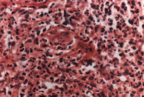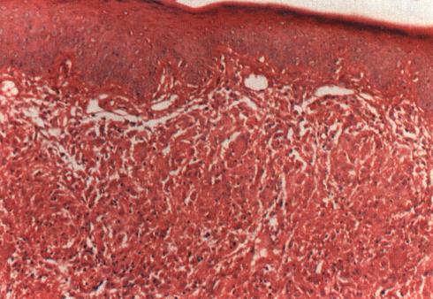 照片10 结节性红斑反应(ENL) 小血管壁及浸润内有大量多核白细胞浸润。 (二)Lucio现象 仅见于中美洲(主要是墨西哥)及其临近地区的弥漫性瘤型麻风病人。R.Lucio于1852年首先记述了这一反应现象,故名。其临床表现为成批发生的出血坏死性红斑。在组织学上,除真皮内存在一些小肉芽肿或孤立散在的巨噬细胞外,还存在导致皮肤出血和梗死的多发性急性闭塞性血管炎,毛细血管内含有大量的细菌。真皮深部较大的肉芽肿团块周围显示与ENL大致相同的急性炎症改变。 (三)加剧反应 为一种发生于高度活动的瘤型病损的局限性反应。其受累位置是肉芽肿的中心或表皮下的浅表真皮。早期病损显示同巨噬细胞变性相关的嗜中性白细胞浸润。严重的进行性病损则显示浅表淋巴管扩张,反应中心呈现明显的间质水肿,巨噬细胞排列松散,甚或有出血、坏死以及区域性的嗜伊红性变性物质积聚;有时还可见有明显的坏死性血管炎及较多的核尘。反应位置浅表者,可导致大疱和溃疡形成。病损内含有大量的活菌。 |