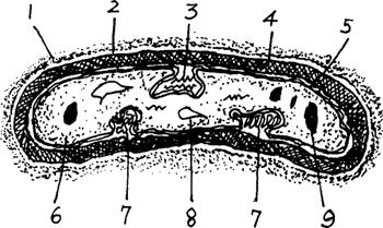 图1-2 超薄切片电镜下麻风杆菌超微结构示意图 1.弥漫外层 2.电子透明带 3细胞核 4.细胞壁 5.细胞膜 6.细胞浆 7.中体 8.空泡 9.多聚磷酸盐颗粒 1.弥漫性外层:约厚16~17纳米,较暗。 2.外壁物质(又称电子透明带):约厚10纳米。可能为菌壁的脂液性腊状物质,或相当于菌胶质。Hanks提出,此膜可能与菌的着染性、抵抗力等有密切的关系,用砜类药物治疗后,ML丧失此膜,通透性亦随之增高。 3.细胞壁:厚约10纳米。有支持作用,并能对抗渗透内压,但无明显的代谢活动。据Draper的研究提示此部分有维持菌的形状和支持抵抗渗透压的作用,对外环境有重要的防御作用。近来研究表明胞壁内含有许多重要抗原成分。 关于带结构(band structure)是Okada1958年提出的。他曾一度研究根据带指数的多少来鉴别分枝杆菌和判断菌的感染力。但目前认为,这是非特异的,其它分枝杆菌(诸如鼠麻风杆菌夏威夷株、鸟结核杆菌和H37RV株结核杆菌)亦发现有带的结构。到目前为止尚未见到带结构与中体问的结构、功能联系的报告,其本质仍待研究。 4.细胞膜:紧靠细胞壁,系双层膜,每层厚约3纳米,为酶的所在部位。现有人研究表明细胞膜为三层,中间一层为电子透明层,其它两层为电子致密层。 5.内浆膜系统:细胞膜嵌入菌之胞浆,形成内浆膜系统。为双层膜的管状结构。此部即为中体(mesosome),可能与细菌的分裂繁殖有关。有人甚至认为即使菌体崩解,只要有中体存在,就能发展成为一条活菌。目前认为ML有横裂与纵裂两种分裂方式。前种分裂方式已趋明晰(图1-3),但后种方式尚不能肯定。