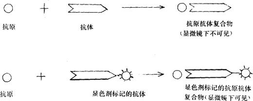 表中“组标志(CD)”是近年来国际上重新修订简化了这些细胞表面标记的命各。OKT是美国Ortho公司提供的系列McAb产品。Leu是美国Becfon Dickinson公司制备的系列McAb。除此外还有Lyt等系列McAb以及许多其它实验室制备的多种McAb。除上表所列外,OKT6可用于识别具有Ia抗原的细胞,包括朗格罕细胞(Langerhans cell),OKTM1识别人单核细胞及无效应细胞,H-NK识别杀伤性T细胞。 上述一些单克隆已用于检测麻风损害中的各种免疫活性细胞,尤其在集中研究淋巴细胞亚群。这方面主要的较为一致的发现是结核样型麻风肉芽肿内TH占优势,而且TH分布特征在于围绕着上皮样细胞肉芽肿。瘤型肉芽肿内以Ts占优势,这是因为瘤型麻风肉芽肿内TH的绝对数与相对数均减少,在T型端TH渐增,而Ts的绝对数在各型麻风损害内均无不同的缘故。Ts与巨噬细胞混合存在。Th/Ts值,T型高,为2~4不等;L型无ENL者<1,发生ENL时Th增加则>1。有人测Th的绝对值,在皮损中T型为1400/平方毫米;L型为200/平方毫米。表皮内的朗格罕氏细胞(OKT6+),T型增高,瘤型减少,但这方面结果尚不一致。与病期也有一定关系。产生白细胞介素2(IL-2)的细胞,T型较多,L型减少。ENL时,IL-2细胞增加,表皮中白细胞介素2受体(IL-2R)也增多。近年来更进一步研究各型麻风损害内CD4和CD8阳性细胞内的不同亚群的百分比。这些对研究麻风病免疫调节机制具有重要意义。 (四)其它方面的研究 1.近年来有人用间接免疫荧光或酶标记的方法测定麻风病人血清内抗神经抗体,用正常神经切片作靶抗原,显示高百分比麻风病人血清中存在抗神经抗体,能与正常神经轴索结合。 2.已知用抗S-100蛋白的McAb,结合过氧化酶技术可证实起源于神经脊的组织。用此原理可以在石腊切片中观察到麻风损害中被破坏了的雪旺氏细胞残迹。此法有助于麻风性结核样肉芽肿的鉴别诊断。 3.Boddingius先用动物制备各种抗麻风药物的抗体,再用免疫病理、免疫电镜等方法并结合激光显微探针分析(AMMA)显示神经、肝、脾内抗麻风药物沉积情况。结果发现,给正常小鼠投予几种抗麻风药物数月后,神经内药物很少,甚至有的药物呈阴性。 4.Tausk等用McAb的放射免疫测定法测定红细胞表面C3b受体(CRI)的情况。结果观察到L型病例红细胞表面的C3b明显减少,平均每一个红细胞具有310个受体,而T型平均为577个,对照组平均为512个。说明L型病人清除血清中免疫复合物的功能降低。 二、免疫病理方法 抗原与相应的抗体接触后,立即结合形成不易分离的抗原抗体复合物,在结合之前如先使抗体(或抗原)与某种显色剂,如荧光素、过氧化物酶等标记,形成的抗原抗体复合物则由不可见成为可见,从而可以确定组织中是否存在某种抗原(或抗体),这就是免疫病理技术的基本原理。用模式图表示如图3-1。