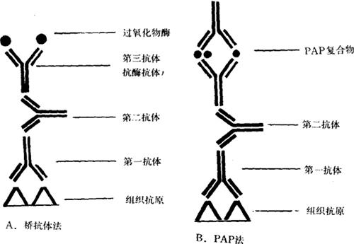 图3-1 抗原和抗体,显色剂标记的抗体结合模式 根据抗体(或抗原)标记物的不同,免疫病理研究方法分为两类,即免疫荧光技术和免疫酶标技术。现分别叙述如下: (一)免疫荧光技术 免疫荧光技术(immunofluorescent technique,IFT)也称荧光抗体技术(fluorescent antibody technique,EAT),其原理是将荧光色素,特别是常用的异硫氰酸荧光黄(fluorescein isothiocyanate简称FITC)与某些特异性抗体(或抗原,但少用)以化学的方法结合起来,但不影响该血清抗体的免疫特性,而后将荧光标记了的抗体,作为一种试剂,在特定的条件下浸染标本,使之与标本中相应的抗原产生结合反应,结果产生含有荧光标记的抗体——抗原复合物,可用荧光显微镜来观察之。在镜下见到有特异荧光存在即表示有抗原抗体复合物的存在。根据已知的抗体(或抗原)即可推知未知抗体(或抗原)的存在。常用的有直接荧光抗体法和间接荧光抗体法。 1.直接荧光抗体法是最简单、最基本的方法,利用荧光色素标记的特异性抗体直接与相应的抗原结合,以鉴定未知抗原。优点:(1)方法简单,需时短;(2)特异性高。缺点:(1)不能用已知抗原检查未知抗体;(2)为了检查各种抗原,则要准备多种特异性荧光抗体;(3)敏感性较差。 2.间接荧光抗体法用荧光色素标记的抗球蛋白抗体,鉴定未知抗原或未知抗体。染色程序分两步,第一步,用已知未标记抗体(第一抗体)加到未知抗原上,或用未标抗体加到已知抗原上,一定时间后,洗脱掉未结合的抗体。第二步,加上标记的抗球蛋白抗体(第二抗体),如果第一步发生了抗原抗体反应,这个抗球蛋白抗体就会和已结合的抗体发生结合,从而推知抗原或抗体的存在。第一抗体对第二抗体来说是其抗原。因此,间接荧光抗体法又称双抗体法。优点:(1)能检查未知抗原和抗体;(2)用一种标记的抗球蛋白抗体,能检查多种以球蛋白作抗体的复合物;(3)敏感性较高,通常比直接法高5~10倍。缺点有:(1)由于参加的因素多,受干扰的机会也多,故判断结果有时较困难;(2)试验方法较麻烦,需要的对照多,所用时间也较长。 免疫荧光法虽然具有荧光素容易与抗体结合、操作简便、观察方便等优点,但其缺点有:(1)标记的荧光极易褪色,不能长久保存;(2)影响荧光强度的因素很多,而且判断阳性荧光与非特异性荧光有一定的主观性;(3)阳性荧光细胞无法与常规石蜡切片对照观察,组织学定位困维;(4)需要较好的设备如冰冻切片和荧光显微镜等。因此,它的应用受到一定的限制。 (二)免疫酶技术 此法是用酶,主要是过氧化物酶,代替荧光素来标记抗体,用3.3′-二氨基联苯胺(DAB)或3-氨基-9-乙基咔吧唑(AEC)与H2O2显示过氧化物酶的活性部位,其反应产物前者为棕黑色,后者为棕红色沉淀,用普通显微镜便能观察,颜色不易消退,标本可长期保存。免疫酶技术有直接法→间接法→桥法→单PAP→双PAP和ABC法等。 1.直接法 先将酶(常用辣根过氧化物酶horseradishperoxidase)与相应的抗体结合,形成酶标记抗体,再与组织切片内的抗原结合,形成酶标记的抗原抗体复合物,最后用该酶的特殊底物DAB或AEC显色。本法操作简单,需要的抗血清少,专一性强,但灵敏度低。当组织内抗原较弱时,常呈假阴性反应。 2.间接法 抗原与相应的抗体(第一抗体)结合后,形成了抗原抗体复合物。此抗原抗体复合物再与酶标记的抗第一抗体的第二抗体结合,成为酶标记的抗原抗体——抗抗体复合物,最后用底物显色后,即可在显微镜下观察。灵敏度较直接法高,且即使抗原不同而第一抗体的动物相同,均可应用酶联的第二抗体。 3.PAP法(酶-抗酶法) 是改进了的桥法。其原理是将桥法中抗体3(抗辣根过氧化物酶抗体)与辣根过氧化物酶结合而形成酶抗酶(PAP)复合物。此PAP复合物再与抗原-抗体1-2结合而成为酶联的抗原-抗体-3复合物。它的特点是预先已制成PAP复合物,因此标记切片过程缩短,其次,所形成复合物系由两个抗酶抗体分子和三个酶分子结合成为较大的PAP复合物,故其敏感性较桥法高,而且消耗的酶也更少。(图3-2)