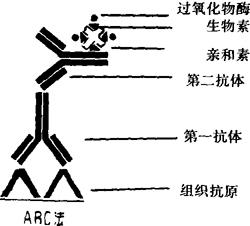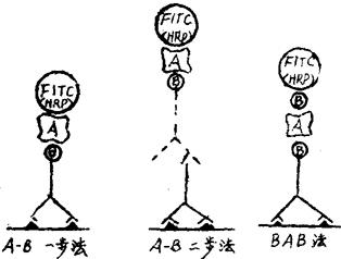 图3-3 ABC法原理示意图 由于ABC法不需要过量的生物素标记的第二抗体,因而除第一抗体可高度稀释外,同时可用高度稀释的第二抗体。据Hsu氏等报导,ABC法的敏感性较单PAP法高8~40倍。 A-B一步法 为顺序使用生物素标记的抗体及酶或生物素标记的亲和素。 A-B二步法 先用第一抗体,再用生物素标记的第二抗体,然后加酶或荧光素标记的亲和素。