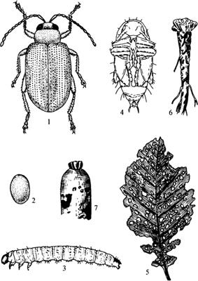 图5-85 黄条跳甲 1.成虫 2.卵 3.幼虫 4.蛹 5.被害叶 6.被害根 7.被害萝卜 【生活习性】 在华北1年发生4~5代,华东4~6代,华南7~8代。长江以北地区,以成虫在残株、落叶下、土缝或杂草中越冬。 在湖南2~11月都发生为害。成虫善跳跃,遇惊动即跳走,有趋光性。多栖息于叶背,将叶片咬成无数细密小孔。成虫寿命平均30~80天。卵产于土下约1厘米深的根部附近土粒上,晴天午后产卵最多。产卵成块。每块有卵几粒至20多粒,第一、二代25粒左右,越冬代可达621粒。卵期在17~27℃时为4~9天。在湿润条件下才能孵化。幼虫3龄,历期12~20天,老熟后入土3~7厘米深处化蛹。前蛹期2~12天,蛹期3~17天,适温为20~28℃。 【防治方法】 清洁田园。清除杂草、落叶、残株,可减少虫源。越冬成虫春季开始活动、未产卵前,喷25%安绿宝2000倍液,或40%速扑杀乳油1500倍液。 |