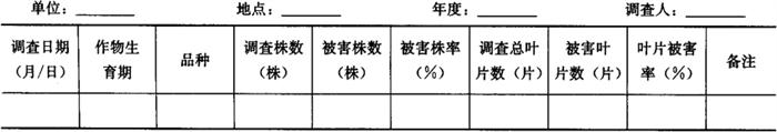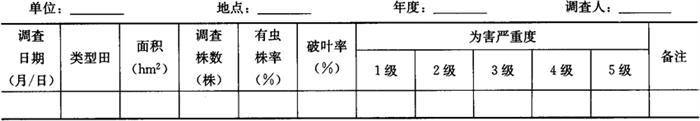 1.3 大田虫情巡回普查 1.3.1 调查时间 从当地黄条跳甲发生盛期开始至年度的发生末期止。 1.3.2 调查方法 采用对角线5点取样法,每10天1次,每点取样20株。调查虫害株率。将大田虫情巡回普查结果汇总填入表6-122。 表6-122 黄条跳甲大田普发率调查表