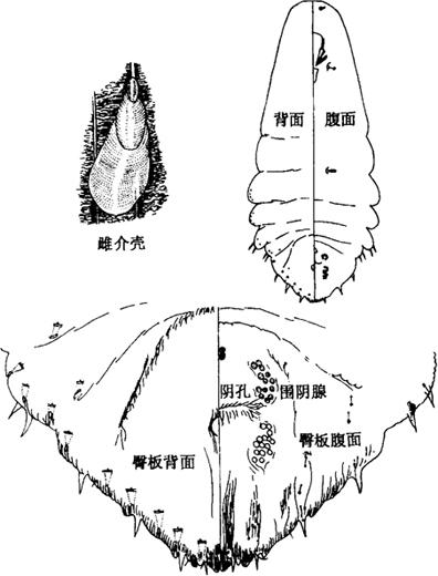| 释义 | 黄杨并盾蚧 【学名】 Pinnaspis huxi Bouche。 【分布与为害】 分布浙江、福建、上海、陕西、辽宁、广东等地。寄主有杜鹃、大叶黄杨、棕竹、牡丹等。成虫和若虫寄生牡丹叶面主脉两侧吸汁为害,致使植株生长不良。 【形态特征】 雌介壳长梨形,长约1.5毫米,扁平。壳点偏于一端。虫体呈细长纺锤形,长1毫米,宽0.3毫米,老熟虫体后胸及第一至三腹节两侧呈锥状突起。触角1毛。前气门腺5~6个,后气门腺3个,阴腺5群。臀叶2对,发达。肛门近于板中或稍前。体背的肛前疤全缺。 雄介壳长形,长为1.4毫米,白色溶蜡状,背面有3条纵脊。虫体有翅1对,触角丝状,腹末有短针状生殖刺(图9-101)。卵黄色,长卵圆形。1龄若虫壳点在介壳一端,向外突出,呈黄褐色。3龄介壳淡褐色或深褐色。