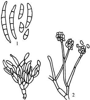 图2-4 黄瓜枯萎病原菌 1.分生孢子梗及大型分生孢子 2.小型分生孢子着生状 3.发病条件 土壤中病原菌的多少是当年发病程度的决定因素之一,是病害的主要侵染来源。所以,重茬地发病重。重茬的次数越多,土壤中积累的菌量越大,发病越重。土壤高湿是影响发病的重要因素。根部积水,促使枯萎病的发生蔓延。高温是病害发生的有利条件。病菌发育最适宜的温度为24~27℃,土温24~30℃,病害发展快。氮肥过多以及酸性土壤,不利于黄瓜生长,而有利于病菌活动,在pH4.5~6的土壤中,枯萎病发生最多。线虫发生多的地方,由于线虫刺吸根部养分造成伤口,降低植株抗性,有利于病菌侵入,病害发生重。 4.防治方法 (1)合理栽培管理,提高植株抗性 深翻土地,高畦栽培,发病严重的大棚、温室要采取5年以上与非瓜类作物轮作。施用腐熟的基肥,及时追肥浇水,不可大水漫灌,防止植株早衰和茎基部因土壤水分供应不均衡,产生自然裂伤。发病时要控水,拔除病株,并用石灰等进行土壤消毒。 (2)采用无病种子或种子消毒 从无病田中采种。种子消毒,可用有效成分0.1%的60%防霉宝(多菌灵盐酸盐)超微粉,加0.1%平平加渗透剂,浸种1~2小时,或用50%多菌灵可湿性粉剂500倍液,浸泡种子1小时,或用40%甲醛150倍液浸种1.5小时,然后用清水冲洗干净再催芽播种。因品种不同,要预先做好药害试验,视对种子发芽影响状况决定甲醛使用的浓度,或干燥种子(含水量低于10%)置于70℃恒温条件下处理72小时,处理完要检查发芽率后再播种。 (3)选用抗病或耐病品种 品种间的抗病程度有一定的差异。长春密刺、津春2号、津杂3号、4号、津早2号、3号、4号、中农5号、7号、13号、龙杂黄3号、碧春、满园绿、三季溢香、吉选2号、鲁黄1号、保丰、春秋绿等均较抗病,可根据情况选用。 (4)无病土育苗 用新土或消毒的土壤作营养钵育苗,可减少苗期病菌侵染。 (5)发病初期或发病前进行药剂灌根 用50%多菌灵可湿性粉剂500倍液,每株灌药液0.25千克,隔7天灌1次,连续灌2~3次,灌根农药还可选用40%多菌灵胶悬剂400倍液或50%甲基托布津可湿性粉剂400倍液或10%双效灵水剂200~300倍液,或甲福混剂(70%甲基托布津可湿性粉剂+50%福美双可湿性粉剂按1∶1比例混合)800倍液,或20%甲基立枯磷乳油1000倍液,均有一定效果。或用2%农抗120水剂150~200倍液,或5%菌毒清水剂300倍液灌根,防效约70%。 (6)土壤消毒 ①苗床消毒 每平方米用50%多菌灵可湿性粉剂8克处理畦面。定植前用50%多菌灵可湿性粉剂每公顷30千克,或甲福混剂37.5千克,混入细干土450千克,混匀后,均匀撒入定植穴内。日本在夏季高温季节,利用日光进行土壤消毒,即黄瓜拉秧后,每公顷用15吨稻草或麦秸,铡成4~6厘米长,撒在地面,再均匀撒施石灰氮1500千克或石灰3000千克,翻地,铺膜,灌水,然后密闭大棚、温室15~20天,地表土壤温度可以达到70℃以上,10厘米土层内温度达60℃,对枯萎病及其他土传病害、线虫等均有较好的防治效果。 ②溴甲烷熏蒸 方法参照黄瓜根结线虫病。 (7)嫁接换根 利用南瓜根系发达,对黄瓜枯萎病菌有较强抗性的特点,用南瓜做砧木,黄瓜做接穗,进行嫁接换根,防治黄瓜枯萎病的防效可达95%以上,并有明显的增产效果。嫁接换根防病的具体方法如下。 选择砧木 黄瓜嫁接栽培,国内外都是以冬春大棚、温度栽培为主。因此,多用根系发达较耐低温的黑籽南瓜作砧木。黑籽南瓜嫁接黄瓜的嫁接亲和力高,在温度和湿度适宜的条件下,嫁接成活率100%;根系发达,较耐低温,在地温较低的情况下,根系的伸长能力比其他种南瓜强;嫁接后所结黄瓜无异味,仍可保持黄瓜原有风味;黑籽南瓜单瓜种子400粒左右,每千克有种子约4500粒。饱满的种子外种皮黑色,有光泽,稍瘪的种子褐色。种子有休眠期,当年采收后立即催芽,不仅发芽率低,而且发芽不整齐,愈是饱满的种子,当年发芽率愈差。褐色稍瘪的种子,反比黑色饱满的种子发芽率高。黑籽南瓜的种子发芽,要求较高的温度,通常为30~33℃。适于黑籽南瓜生长的地区不广,往往不能满足砧木的需求。 其他的砧木有辽宁省的南砧1号、佳木斯南瓜。河北省多用瓠瓜种子,效果也较好。日本普遍采用土佐系南瓜。这是印度南瓜和中国南瓜的一代杂交种,由于是种间一代杂种,后代分离严重,所以不能直接留种。 选择接穗品种 要根据大棚、温室生产的季节选择黄瓜品种做接穗。一般与不嫁接栽培所用的黄瓜品种相同。如北京地区冬季加温温室、大棚采用长春密刺、北京刺瓜、农大14号;春季大棚早熟栽培选用津研2号、津研6号等品种;秋大棚延后栽培采用津研2号等。 育苗 首先要准备好嫁接用的砧木和接穗用苗。先将黄瓜种子放入盆内,倒入55℃的热水中浸泡15分钟,后放在温水中浸泡4~6小时,捞出滤干,用湿布包好,放在25~28℃温箱中催芽,20小时后即可出芽。待根伸长到0.5厘米时即可播种。根不宜过长,否则播种时苗容易折断。南瓜种籽的浸泡方法与黄瓜相同,但在温水中浸泡8~12小时,催芽温度为30~31℃,经36小时后出芽。已发芽的种子如遇天气不好未及时播下时,可将种子放在10℃以下的冷凉处,也可放入冰箱(2~4℃),2~3天后播种。存放时要保持湿度,防止种子风干,并注意防止种子受冻。播种时应事先准备好育苗盘和育苗钵。将发芽的黄瓜种子均匀地播在育苗盘中,种子间距1~1.5厘米,覆土厚1厘米,再浇水;南瓜种子距离1~1.5厘米,覆十比黄瓜厚。在育苗钵中播南瓜