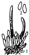 图2-5 瓜类炭疽病病原菌 1.分生孢子盘(分生孢子梗、分生孢子及刚毛) 2.分生孢子 3.发病条件 高温、高湿是黄瓜炭疽病发生流行的主要条件。在适宜的温度条件下,空气湿度越大,越容易发病,潜育期也越短。相对湿度为87%~95%时潜育期3天,湿度小于54%,不发病。温度在10~30℃范围内都可以发病。24℃左右发病最重,28℃以上病轻。大棚通风不好,氮肥用量过多,灌水过量,连作重茬,发病重。成熟瓜条抗病性低。 4.防治方法 (1)选用抗(耐)病品种 津杂1号、2号、津研7号、碧春、满园绿、中农5号等品种,可因地制宜选用。 (2)选用无病种子,种子消毒 从无病种株上采种。种子用55℃温水浸种15~20分钟,取出立即置冷水中降温后催芽,或用40%甲醛150倍液浸种1小时,或100倍液浸种半小时,或50%代森铵水剂500倍液浸种1小时,捞出后用清水冲洗干净,催芽播种。 (3)加强放风 降低湿度,使棚、室内湿度保持在70%以下,减少叶面结露和吐水。 (4)加强栽培管理 增施磷、钾肥,重病棚、室与非瓜类蔬菜进行3年轮作,及时清洁棚室,把病叶、残株集中深埋或烧毁。 (5)药剂防治 发病初期,先摘除底部老叶、病叶,后喷洒以下药剂的一种:50%多菌灵可湿性粉剂500倍液、75%百菌清可湿性粉剂500~600倍液、50%甲基托布津可湿性粉剂500倍液、70%代森锰锌可湿性粉剂400倍液、80%炭疽福镁可湿性粉剂600倍液、40%拌种双可湿性粉剂500倍液、25%炭特灵可湿性粉剂500倍液、50%代森铵水剂1000倍液,或2%抗霉菌素(农抗120)水剂200倍液,每7天喷1次,连续3~4次,每公顷喷施药液750~900千克。 |