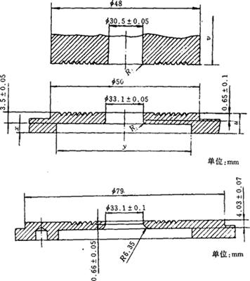 图8-2-24 夹盘系统的尺寸 注:图中尺寸u与v应保证使用时夹盘不变形;x和y的尺寸决定于耐破仪的底座与使用的胶膜:R1=0.2mm;R2=3mm ①上夹盘与加压轴用钢珠或相似的活节装置连接。以保证夹盘压力分布均匀。 ②上、下夹盘内孔应同心,同心度的最大偏差不得超过0.25mm,两夹盘表面应平整而且相互平行。 ③为防止试样滑动,两夹盘间应有足够的夹持力。该力的大小以不损坏试样为限。一般夹持力不低于430kPa。 如与上述规定的夹持力不同时,应在报告中加以说明。 (2)胶膜: ①胶膜是圆形的。由纯橡胶的弹性材料制成。其厚度为0.8~0.9mm。 ②固定夹紧胶膜时,要使胶膜的上表面比下夹盘的上表面低约3.5mm。 ③胶膜的弹性阻力,在胶膜凸出下夹盘表面9mm时,其阻力应为30kPa±10kPa。 (3)液压系统:由活塞推动适宜的液体(如化学纯甘油;含缓蚀剂的乙烯醇或低粘度硅油)。向胶膜下匀速施加液压,直到试样破裂。液压系统和使用的液体应没有空气泡,活塞送液量95mL/min±5mL/min。 (4)压力表: ①布尔登管式压力计,在压力表量程的25%~75%范围内使用,绝对不得在低于15%及高于85%的量程范围内使用。表盘刻度最小直径为95mm,刻度的弧度不小于270°,工作量程内任一点的精度应为最大量程的±0.5%,压力表应有排气孔,表盘至少分成70个格。 ②压力表的膨胀性,在整个工作量程应稳定在20%之内,即使在最大量程时,需输给的液体也不超过0.4mL。 ③压力表与指针间的摩擦力矩约0.3mN·m,而指针转动惯量在1~10g·cm2为宜。 ④压力传感器,操作惯量可忽略不计,膨胀和压力记录器的误差在0.2%以内,数字显示装置,试样破裂后,读数变化不大于1个单位。 4.方法 首先选择合适的测量范围,须预测时,用大量程的压力表进行。 将试样夹于上、下夹盘间,试样必须超过上夹盘的整个面积,落下上夹盘,调至所需的压力,开动仪器以适当的速率增加压力,直到试样破裂。退回活塞直到胶膜低于下夹盘的表面,读取压力表(或数字显示)的压力值。然后抬起上夹盘,读数回零,以备下一个测试。若发现试样滑动或因压溃而破裂不正常者,应将该读数舍去。 如:读数低于70kPa时,可用多层纸页测试,使读数超过70kPa即可。测定结果除以层数。确定应使用的纸页层数后,将沿纸的横幅均匀切取试样,以正反面各10个贴向胶膜进行测定。 5.计算 平均耐破度P(kPa),按下式计算: