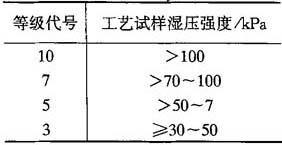 铸造用膨润土按工艺试样湿压强度分为四级,见表5-29,按工艺试样湿拉强度分为四级,见表5-30;按pH值分类,见表5-31. 表5-28 黏土按工艺试样干压强度分级
