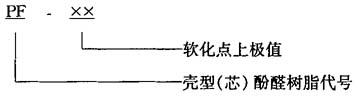 式中ω(SiO2)和ω(Na2O)是它们的质量分数. 5.2.2.4 酚醛树脂(ZBG39005—89) 用于制备壳型(芯)热法覆膜砂的酚醛树脂黏结剂,其牌号表示如下: