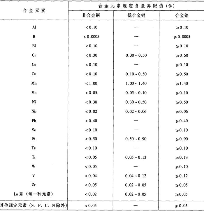 | 释义 | 黑色金属的分类 1.钢的分类 钢是指以铁为主要元素、含碳量一般在2.1%以下,并含有一定数量其他元素的材料。 工业用钢的种类很多,可以按化学成分、性能、品质、用途及内部组织等特点进行分类。采用较多的是按冶炼方法、品质和用途分类。 (1)按冶炼方法分类 钢按冶金方法分为平炉钢、转炉钢、电炉钢、炉外精炼钢。平炉钢的主要品种是碳素钢、低合金钢和部分合金钢;转炉钢的主要品种为碳素钢、低合金钢和少量合金钢;电炉钢的主要品种为优质钢和合金钢;炉外精炼钢的主要品种为特殊质量碳素钢、低合金钢和合金钢。 (2)按脱氧程度和浇铸制度分类 钢按脱氧程度分为沸腾钢、镇静钢、半镇静钢。 (3)按品质分类 钢按品质分为普通钢、优质钢、高级优质钢。 普通钢含杂质元素较多,其中硫、磷含量分别≤0.055%和0.045%。主要用于建筑结构和要求不太高的机械零件。属于这类钢的有普通碳素钢、普通低合金钢等。 优质钢杂质元素含量较少,质量较好,其中硫、磷含量均应≤0.040%。主要用做机械结构零件和工具。属于这类钢的有优质碳素结构钢、合金结构钢、碳素工具钢等。 高级优质钢含杂质元素极少,其中硫、磷含量均应≤0.030%。主要用做重要的机械零件和工具。属于这类钢的大多是合金结构钢和工具钢。这类钢的钢号后面常加符号“A”或汉字“高”标示。 (4)按用途分类 钢按用途可分为结构钢、工具钢、特殊钢和专业用钢。结构钢是焊接结构中常用的钢种,广泛地用于建造厂房、船舶、锅炉、桥梁等,要求有好的焊接性,多在热轧或正火状态下使用。低合金高强度钢也是一种低碳结构用钢,合金元素含量较少,一般在3%以下,其强度显着高于相同碳量的碳素钢,具有较好的韧性、塑性以及良好的焊接性和耐蚀性,应用广泛。 (5)其他分类 钢按制造加工形式分为铸钢、锻钢、热轧钢、冷轧钢、冷拔钢;按金相组织可分为退火组织、正火组织等;按化学成分可分为非合金钢、低合金钢和合金钢三类,这三类钢合金元素规定含量的界限值见表2-1-1,当Cr、Cu、Mo、Ni四种元素,有两种及两种以上的元素同时存在于钢中时,所有这些元素的规定含量总和应不大于这些元素最高界限值总和的70%。否则,即使每种元素的规定含量低于规定的最高界限值,也应划入合金钢。上述原则也适用于Nb、Ti、V、Zr四种元素。 表2-1-1 非合金钢,低合金钢和合金钢合金元素规定含量界限值[1]