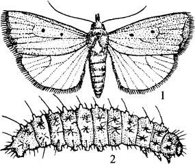 图9-18 鼎点金刚钻 1.成虫 2.幼虫 【生活习性】 长江流域1年4~5代。以蛹在落叶中越冬。次年4月羽化,产卵于嫩梢附近、腋芽和嫩叶等处。每雌可产卵100多粒至数百粒。卵期几天至十多天。孵化后食嫩梢,造成枝梢变焦下垂。幼虫期15~20天,蛹1~2周。在6~9月均可见到成虫。世代重叠。 【防治方法】 及时处理枯枝、落叶中越冬蛹。成虫羽化盛期点灯诱杀。幼虫盛孵期前喷敌敌畏或杀螟松1000倍液,或杀灭菊酯3000倍液。 |