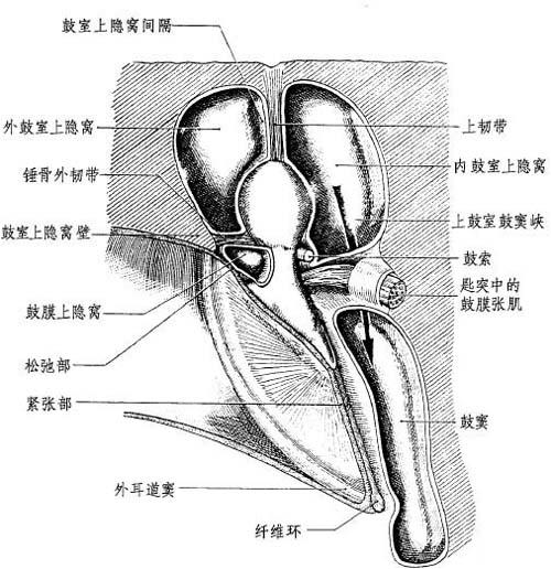 | 释义 | 鼓室局部解剖 鼓室清楚地分为2层:①上层:鼓室上隐窝或上鼓室;②下层:鼓室房(图4-10)。