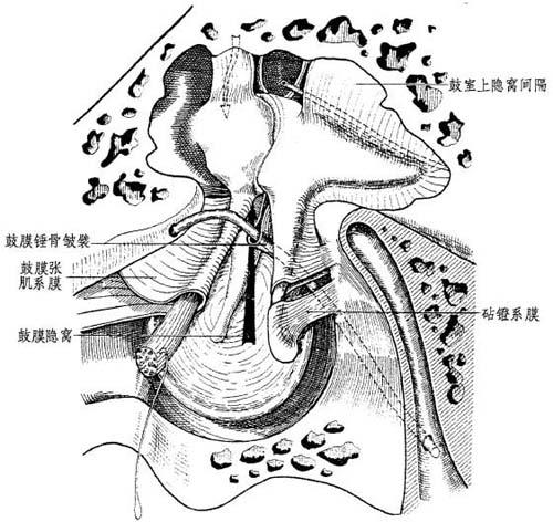 图4-10 鼓室黏膜皱襞(前面观) 3种因素协助此分类。鼓室在其中部缩紧在:①内侧:面神经管及鼓室的鼓膜张肌管的鼓室部分;②外侧:鼓室上隐窝壁之间。其宽度,此处不及2mm。内有听骨链和其肌肉、韧带装置。还有黏膜皱襞,特别是遮盖听骨链到鼓室壁各处的纯系膜是有血管和韧带的。 起初,此装置的全部成分都位于上皮腔的外面。 当发育成长时,它们才进入鼓室铺盖各壁的黏膜自行解脱而出。此黏膜以腹膜方式使其成长。由于形成黏膜皱襞,纯系膜均有血管及韧带。 这些皱襞,尤其是分隔鼓室上隐窝,并使其与鼓室窦分开,穿过鼓室上隐窝-鼓室隔膜的连接孔的皱襞,在3个月前的乳儿是很窄的。 在成年人,鼓室黏膜常很薄,有时缺如。 从手术方面考虑才再分出鼓室房。 一、下层 1 .鼓室房或所谓的固有鼓室 比上层大得多(2~3 cm)。鼓室房的腔相对得要空些。其中可见到:①砧骨长脚、镫骨。②砧镫系膜,尤其是隔开的鼓窦入口下区。砧骨长脚(豆状头)和镫骨(镫骨室)盖帽形成一个二面角,因镫骨肌所致,其棱边呈隆起状;通常极薄,也常缺损。③锤骨前和后韧带以及鼓索,两者将黏膜顶起呈二皱襞。这些也是鼓索神经的系膜或鼓膜。锤骨皱襞(TrÖltsch):这些皱襞同鼓膜紧张部形成鼓膜前、后二隐窝。后者组成两个小鼓室房的憩室,通常与鼓上隐窝不相通。 2.鼓室房的下属部分 根据手术操作方便将鼓室房区分为: (1)中央部:中鼓室,恰为鼓膜和鼓岬。 (2)向后:后鼓室,外侧界于外壁的后鼓膜部分。在这里鼓室可经乳突途径达到面神经隐窝,并看到鼓室腔架。 (3)在下方,下鼓室,外侧界于外侧壁的下鼓膜区。此隐窝有时是颈静脉球体瘤所在地,其可接近骨部外耳道,可看到鼓室腔架全貌。 鼓室房的前鼓膜部,可看成是咽鼓管骨段或前鼓室的延续部分。前鼓室敞开在鼓室房中并非鼓上隐窝中。 二、上层或鼓室上隐窝或上鼓室 它又称上鼓室隐窝或听骨链窝。与鼓室窦相反,上层不太高,尤其是前方,这是其上层填满了由大量骨-韧带形成多发性间隔。 1 .各壁 (1)外壁:骨质,为上隐窝壁所封闭,除其下部外,呈凹状,为鼓膜松弛部所嵌。 (2)内壁:鼓室迷路壁,位于面神经管上方。 (3)后壁:此乃鼓室后壁的锥体上部分,这里有鼓窦入口和鼓窦。 (4)前壁:明显缩小,因为上鼓室终止于咽鼓管口的上角处,实质上它常是个明显的垂直壁。 (5)上壁:即为鼓室盖,向后延续到鼓窦和鼓窦入口顶盖。 (6)下壁:由上鼓室间隔分成两部分。 2.矢状隔(或称上鼓室间隔) 实质上将上鼓室分成两个次室:外上鼓室、内上鼓室。 (1)上鼓室间隔为骨韧带,呈矢状,斜向下内方。在其后1/3连接到外壁上。它在中1/3处分开向前变成正中部。 呈三角形,有:①一个后顶位于鼓窦入口处;②一个前底部,毗邻锤上韧带及其系膜;③一个插入鼓室盖的上缘。 由后向前,它包括:①砧骨短脚;②砧骨体和砧骨上韧带;③锤骨头和颈以及锤骨上韧带。 (2)内上鼓室,是两分室中最大者。 ①位于:向下,迷路壁;向外,上鼓室隐窝间隔;底板仅占前一半,后一半缺如,以上三者之间。 ②在其前半部,骨板由鼓膜张肌腱下面遮盖的系膜构成。此乃方形帆,水平地遮盖锤骨颈到咽鼓管嵴上方,其四邻为:向后,鼓膜张肌腱;向前,咽鼓管上嵴;向内,鼓膜张肌管;向外,锤骨前韧带。 ③向后方,上鼓室借上鼓室-鼓室峡与鼓窦相连。这是一条长6mm,宽2mm的延长裂缝。 毗邻:向前,鼓膜张肌腱;向后,鼓窦入口槛;向外,砧骨体和短脚;向内,在匙突和卵圆窗间的面神经隆起。 ④内上鼓室是一个非隔腔室,它通向:向后,直接与鼓窦入口;向下,经上鼓室-鼓室峡与咽鼓管和鼓室房;向前,由一三角小孔与外上鼓室到后基底部同外上鼓室邻接下方的锤骨前韧带、后方的上鼓室间隔游离缘、上极前方缓缓下降的天盖板。 (3)外上鼓室:比较小且被分割开,呈角形,其终端细长,朝向后方。描述较困难,在后方是砧骨短脚依附的外壁。 ①向前稍扩大,是锤骨头所在地。 周壁:在内侧,上鼓室间隔;在外侧,颞骨鳞部海绵状组织;在下方,上鼓室外壁形成的骨板和内侧的锤骨外韧带。 ②鼓膜上隐窝(Prussak囊)是上鼓室的典型部分。四邻界限:向上为锤骨上韧带,向下为轴韧带和锤骨短突,向外为松弛部(图4-12)。