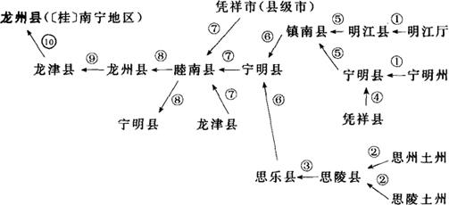 ①1912年称明江厅、宁明州;1912年改为明江县、宁明县。②1912年称思州土州、思陵土州;1916年二土州合并置思陵县。③1917年思陵县更名为思乐县。④1951年凭祥县并入宁明县。⑤1952年,明江县、宁明县合并置镇南县。⑥1953年,镇南县、思乐县合并复置宁明县。⑦1958年12月,凭祥市(县级市,1956年析凭祥镇设市)、宁明县、龙津县三县合并置睦南县。⑧1959年1月,撤销睦南县,复置龙州县、宁明县。⑨1959年5月,龙州县更名为龙津县。⑩1961年12月31日,龙津县更名为龙州县。