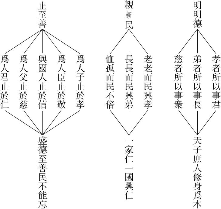 止者,至而不遷也;至善者,人倫之至德也。誠則至。○議曰:止於至善者,為人子止於孝,為人臣止於敬,與國人交止於信,為人父止於慈,為人君止於仁。凡人倫之外,無至善也。‘止至善’一句雖為明德、新民之所通貫,而若其用力,仍是自修,非治人使止於至善也。顔淵問仁,孔子答曰:‘為仁由己,而由人乎哉?’為人君止於仁,亦只是自修,不强勸民使至於至善也。經曰‘帥天下以仁’,帥也者,率也,導也。身先自修,為百姓導率而已。强令民止於至善,無此法也。總之,大學之三綱領,皆人倫之説。今其條目或頗不明,兹為圖如左: