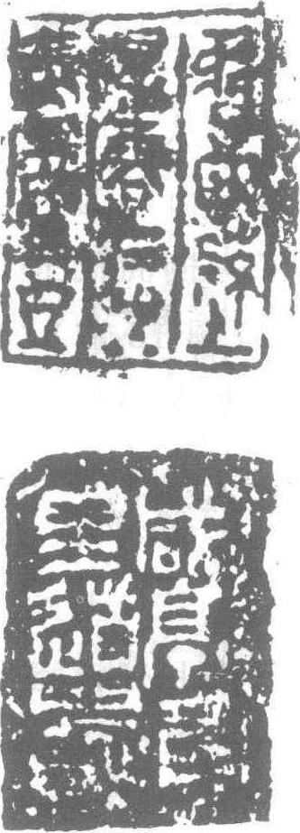 前面我们提到,早在新石器时代的陶器上,已经发现有刻写或绘写的某些图形符号,有的文字学家认为已经具有文字性质,可以说是原始陶文。近几十年的考古发掘,发现了许多战国时期的陶文,其中齐国的最多,燕、秦、滕、邾〔zhu朱,即邹〕等国次之,韩、赵、魏、楚等国也有零星出土。这些战国陶文,有刻写的,也有范印的。所谓范印,就是如同钤盖印章,有的正方,有的长方,有的圆形,内容大都只是标明制作年份、地点,监造者、陶工籍贯姓名、置用地点等,字体大多工整,但不同地区的形体风格有所不同,图14是两枚陶文拓片,上面一方是齐国陶文,释文为: “扈者(都)〔chen陈〕㝵(得)再左里𤽐〔po破〕亳豆。”扈都,地名; 得再,监造者姓名;左里,陶工籍贯;𤽐,陶工名;毫,器物置用地名;豆,一种装食物的器皿。下面一方是秦国陶文,释文为:“咸亭右里道器。”咸,地名,即咸阳;亭,行政区划名;右里,地名,陶工道的籍贯;道,陶工名;器,指器物。