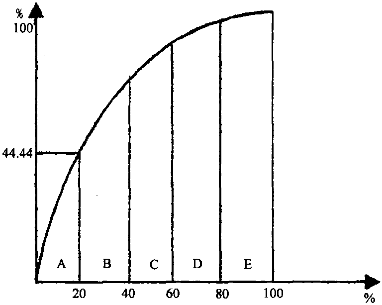 图11-3 帕累托图 第五步确定重点管理方式与管理方法。从帕累托图中可以看出,A类产品虽只有20件,但金额占44.44%,B和C两类40件占金额38.89%,其他两类40件占总金额的16.77%。A类物资最重要,作为重点,加强管理,严格控制;B、C类不如A类重要,可以采用常规方法管理和控制,D、E两类数量繁多,但价值不大,可采用最简便的方法加以管理和控制。 通过分析,分清了管理对象的重要程度,可以使企业有的放矢地采取管理步骤,避免了传统管理方法中走全面和松散管理两个极端。目前这一方法已经推广应用到企业管理的各个领域,尤其在我国进行应收账款和销售对象分析中得到了广泛应用。 ☚ 目标规划 定货点法 ☛ ABC分析法 ABC分析法亦称重点管理法或分类管理法。是一种对经济事物进行分类,并根据其对经济活动影响的大小,保证重点,分别管理的一种管理方法。可广泛应用于生产、流通和社会管理等领域。ABC分析法的基本原理是: 对影响经济活动的各种因素进行分析,按其对经济活动影响的大小分为A、B、C三类。对A类的因素要特别加以注意,重点加强管理; 对B类因素也要比较注意,加以管理; 对C类因素则进行一般性的管理。这样可以掌握管理好影响经济活动的关键因素,既保证了重点,又节省了人力、物力、财力,可以收到较好的经济效果。ABC分析法是由美国通用汽车公司董事长狄基于1951年首次提出的,1955年由巴纳特加以进一步补充和改进,受到广泛的注意和应用。 ☚ 价值工程 量本利分析 ☛ ABC分析法 ABC分析法亦称“帕累托分析法”。由于这种方法通常将事物分成A、B、C三类,故名。由意大利的帕累托首创。该法根据社会现象中广泛存在的“关键的少数和一般的多数”规律,对研究对象按照不同的经济技术特征进行分类排队,分清主要和次要、重点和一般,从而有区别地确定管理方式、追求满意的经济效果。已被广泛应用于工业、商业、物资、人口等方面。其工作程序可分为: (1) 收集、整理数据,确定分析对象的特征。针对不同的研究对象及分析目的,广泛搜集有关数据资料,并用技术指标、价值指标及效果指标反映其状况、水平。(2) 对分析对象进行分类排队,研究数量和特性之间的关系。以物资库存管理为例,在已有数据的基础上计算一定时期某项物资的供应额,并按照供应额从大到小依次排出品种序列,计算各品种的供应额及其占供应额的百分比。(3) 用ABC分析表、ABC分析图等工具直观表示数量和特性之间的关系。如使用ABC分析表,需要把全部库存物资分为A、B、C三类,其中A类物资品种数量占总额10%左右,占用资金总额约70%,B类物资品种数量占总数20%左右,占用资金总额约20%,C类物资品种数量占总额70%,占用资金总额约10%。(4) 实施分类决策,确定各类的管理方法。一般用列“ABC分类管理法表”表示(见表)。