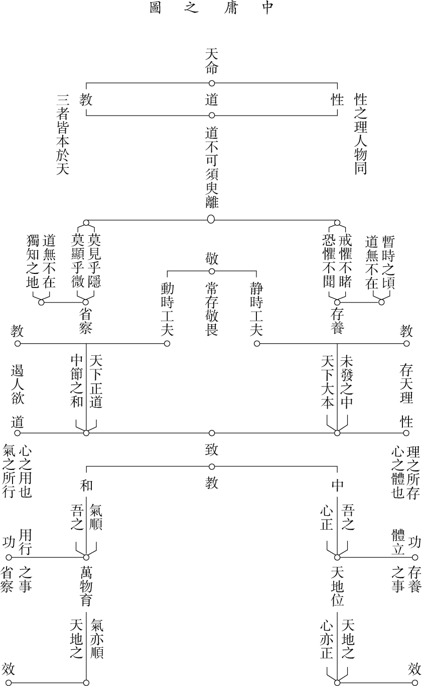 按:中庸,傳道之書,教者之事,而學在其中。道本乎天而備於我之所受,教修乎道而因其我之所有,故章首備舉‘命性、道教’而歷言之。然後單提道字以明道體無所不在,雖不睹不聞、暫時之頃、幽隱細微、獨知之地,皆此道之所存而不可忽之意。而言君子存養省察之學,所以教學者戒懼而存天理以致其中,謹獨而遏人欲以致其和,不使須臾之或離也。故此章大旨,道無不包而教行乎其間,教之所行,即學之所在也。學者苟能因是教而致其為學之功,則教將由我,而位育之極效庶可以馴致矣。