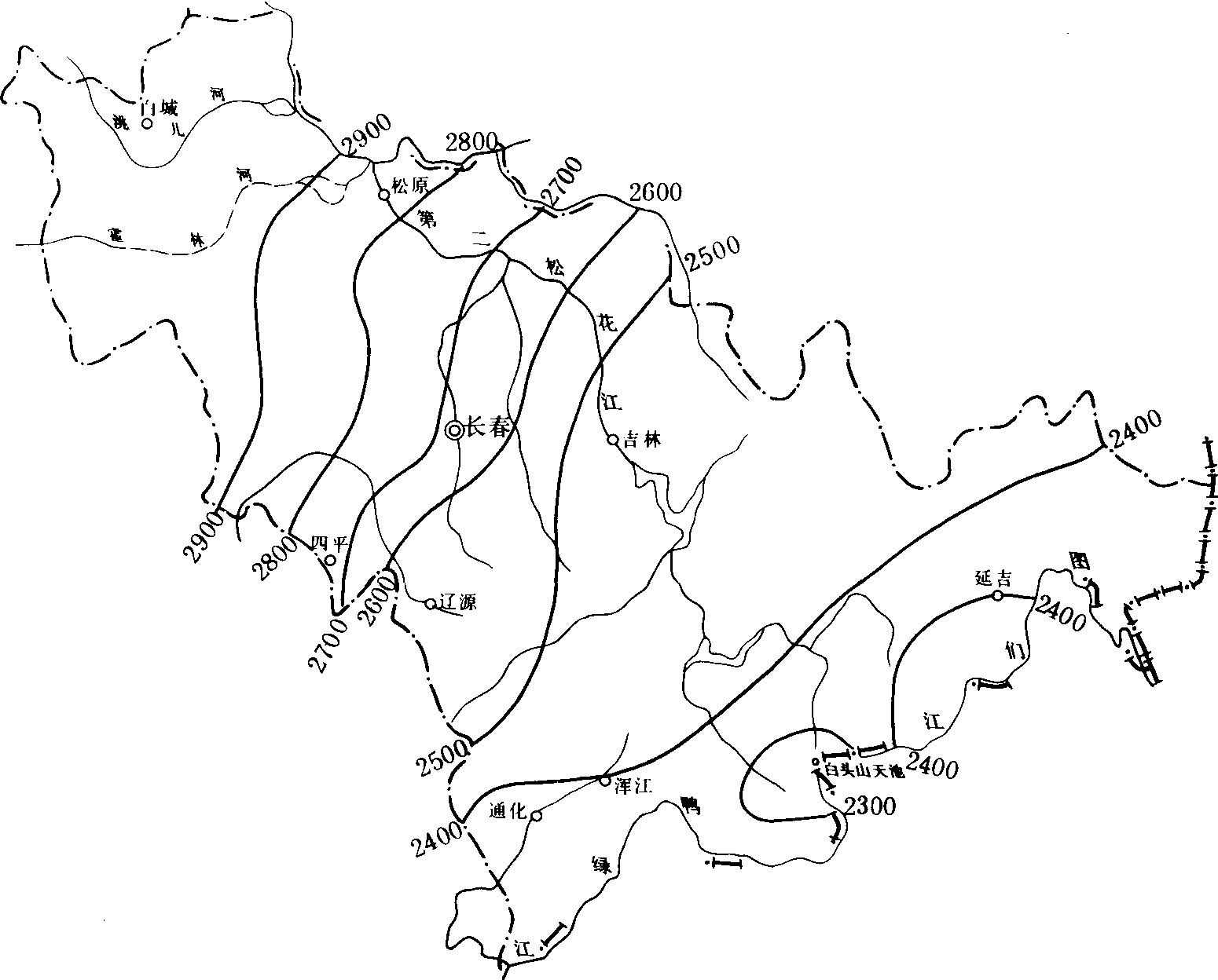 5—9月(农事季节)的日照时数,地理分布趋势也是自东南向西北递增。以浑江地区南部和延边地区东部为最少,一般不足1 000小时;延边地区西部、浑江地区北部、通化地区东南部和吉林地区东部一般在1000—1100小时; 吉林地区西部、长春地区南部、四平地区东部、通化地区西北部和辽源地区一般在1100—1200小时;长春地区北部、四平地区西部一般在1200—1300小时;白城地区一般在1300小时以上,大安一带为最多,达1400小时以上。 ☚ 3.总辐射量 (二)热量资源 ☛ |